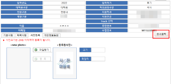 * 출력방법: 지원자화면 > 사진등록 - 우측 중앙 “원서출력” 버튼 클릭